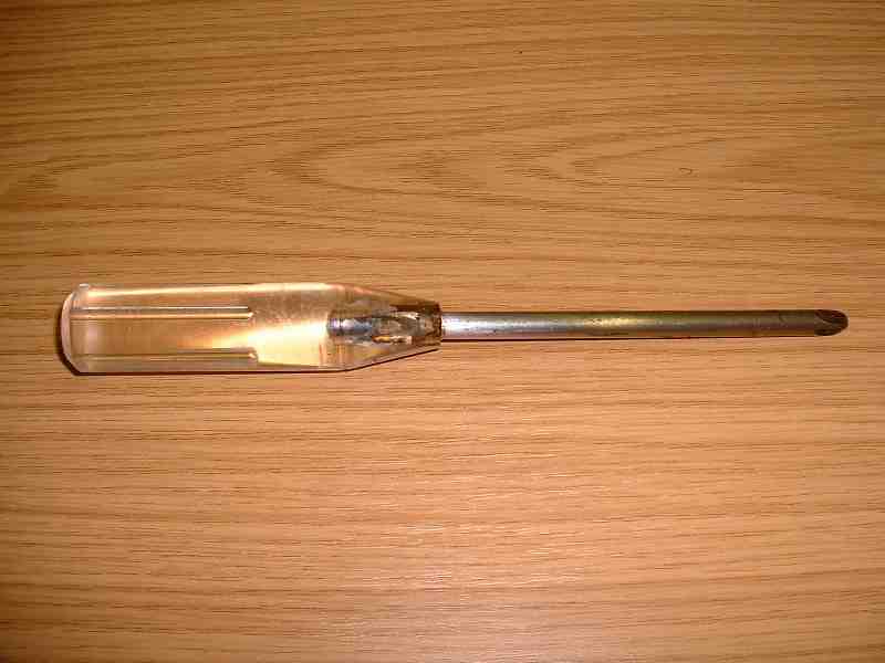 Perspex Handled Screwdriver Tony made three of these and this is the only one left. Very nicely made but the handles shatter if you put any force on them. The Perspex handle is beautifully crafted with machined grips and the point is precision crafted too. Again very nice to look at. |