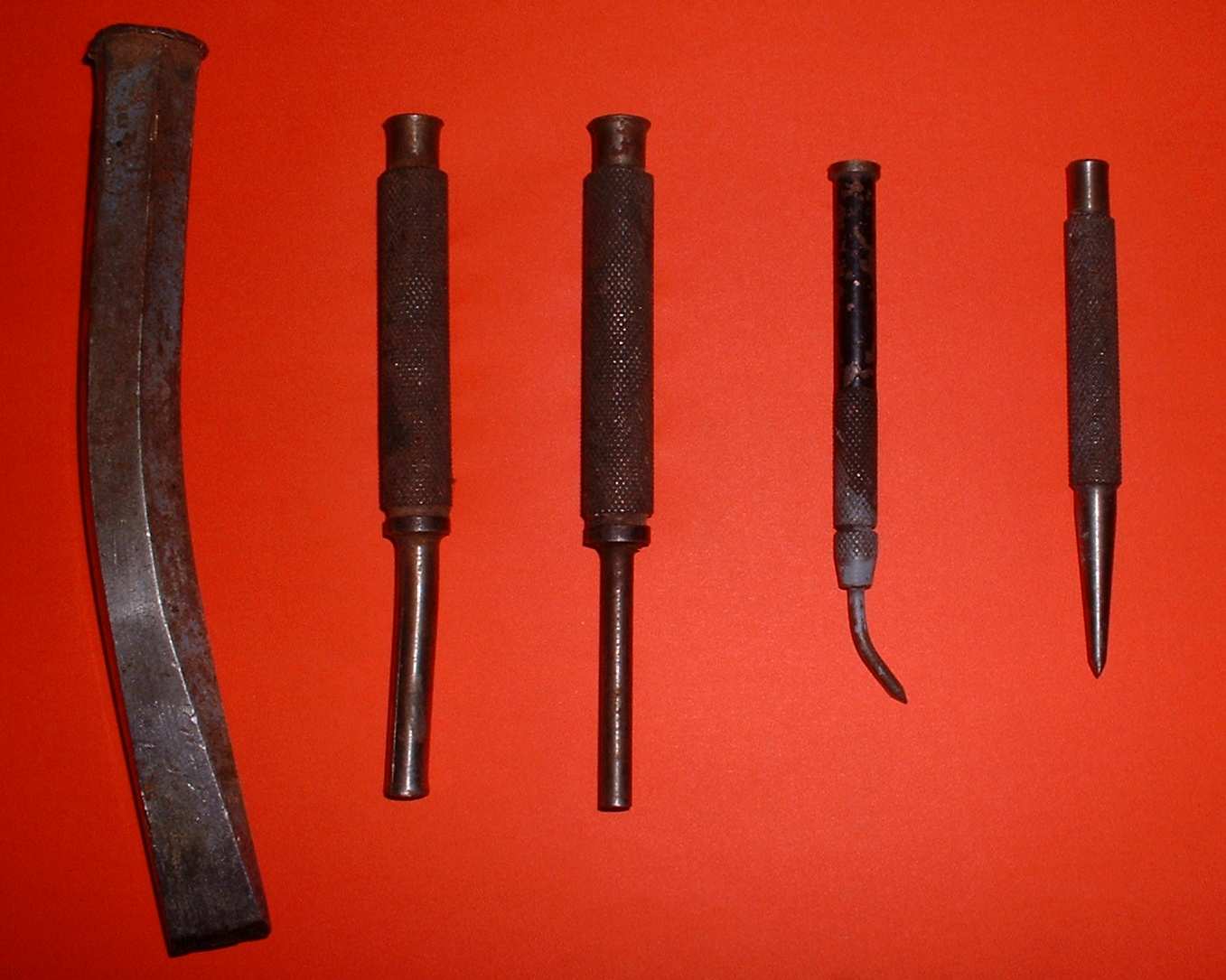 The Pilkington Toolbox Here's a few somewhat abused surviving items of apprentice manufacture. The chisel was originally meticulously filed from a piece of mild steel hexagonal bar and had to be blued flat on a surface plate before being acceptable. The cutting edge was hardened under Winston Atkinson's guidance and is perfectly functional. The shaft however shows up its mild steel origins and readily buckled under some moderate welly. The pin punches were made in a set of three (I've lost one) and taught the young apprentice how to use a lathe and knurling tool. The scriber added screw threading and the center punch allowed you to make something with a sharp point. |