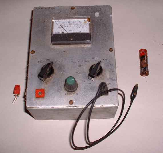 The electrical tool, even the mechanical apprentices made one of these babies. A very simple multimeter in a huge aluminium box, if anyone used them after they were made they were either mad or tight. Anyway as no ex-electrical apprentices have sent a photo of one in we've located one made by a mechanical apprentice. After removing the twenty year old training school battery (what was left of it) guess what - it worked! We were now quite impressed by the units robustness in the face of severe neglect so took a picture of its insides as well. |