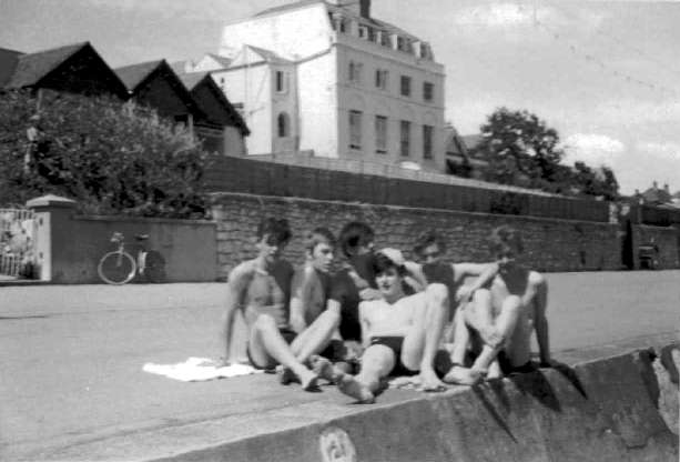 Weymouth Seafront Summer 1966 Not a car or property developer in sight just a bike propped against a wall. Call me daft but I can see a lady standing behind the bushes above the bike dressed in Victorian style clothes wearing a hat with her arms folded watching the group having their photo taken. Left to right: Jim Summers, Bill Browne, Roger Hinde, (me) Karl Ashton, Tom Heaton and Geoff Caswell.