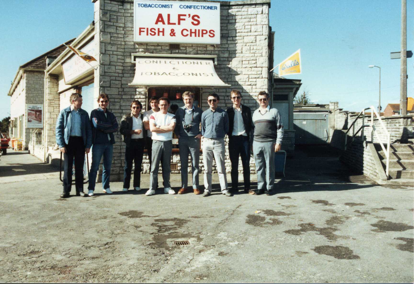 Unfortunately (due to work and family reasons) only nine of us were able to make the nostalgic trip for a weekend in early October 1985 and as we boarded our modern day chariot on the Friday to retrace that journey we were all filled with anticipation and excitement. To add to the excitement and atmosphere tapes of sixties music of 1965 and 1966 were played during the journey. The nine making the trip were Alan Greenhalgh, Ken Green, Steve Aspden, Geoff Caswell, Bill Brown, John Turner, Paul Sinclair (Griffiths), Tom Heaton and me, John Hankin. Of course the journey this time round was much quicker and we arrived in sunny Weymouth late afternoon and after booking into our Hotel we all strolled down the prom and along the beach later taking a quick tour of the centre of town. After our evening meal we enjoyed a drink or two in the local hostelries and retired reasonably early as we were exhausted after the excitement of the day. The first full day of our anniversary tour dawned warm and sunny and our first port of call had to be to Egdon Hall. To our delight, the building was still standing, extended by at least four new wings to become an Admiralty Research Establishment. In place of the well tended privet hedge however stood an imposing security fence with an entrance barrier worthy of any border frontier. We stood there in solemn procession savouring the memories of those days twenty years ago but we had to move on and pausing for a few minutes at Alf’s fish and chip shop for the sake of the faggot and chip lovers in the party and a quick photo. The memory and aromas behind us we continued our journey to Winfrith, passing the famous White Horse at Osmington, taking in swordfish steaks at the Lulworth Cove Hotel, sitting outside in the lovely warm sunshine enjoying the view. Feeling well fed and watered we journeyed to the site itself to see again the familiar buildings of the Training School, well equipped workshops with gymnasium attached, still appearing modern twenty years later. The gym and social club with its distinctive spiralled roof both held special memories. In hindsight perhaps we could have contacted AEA Winfrith to see if we could have arranged a visit inside but then again that may have been fraught with difficulty for security reasons .