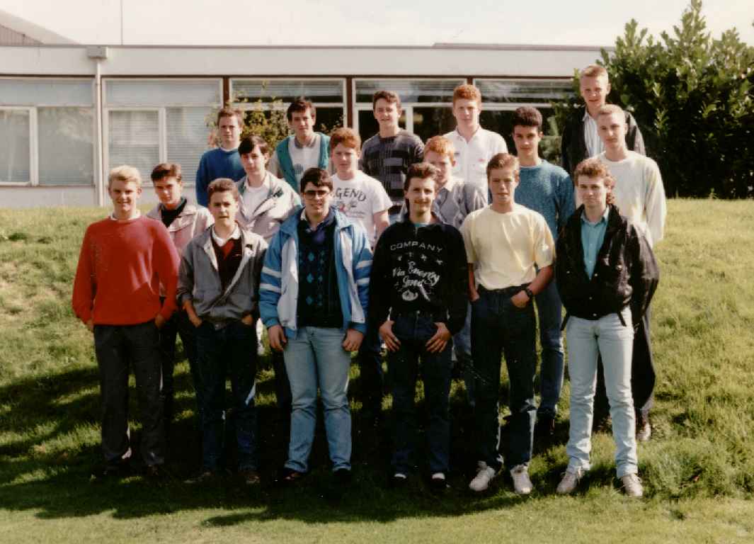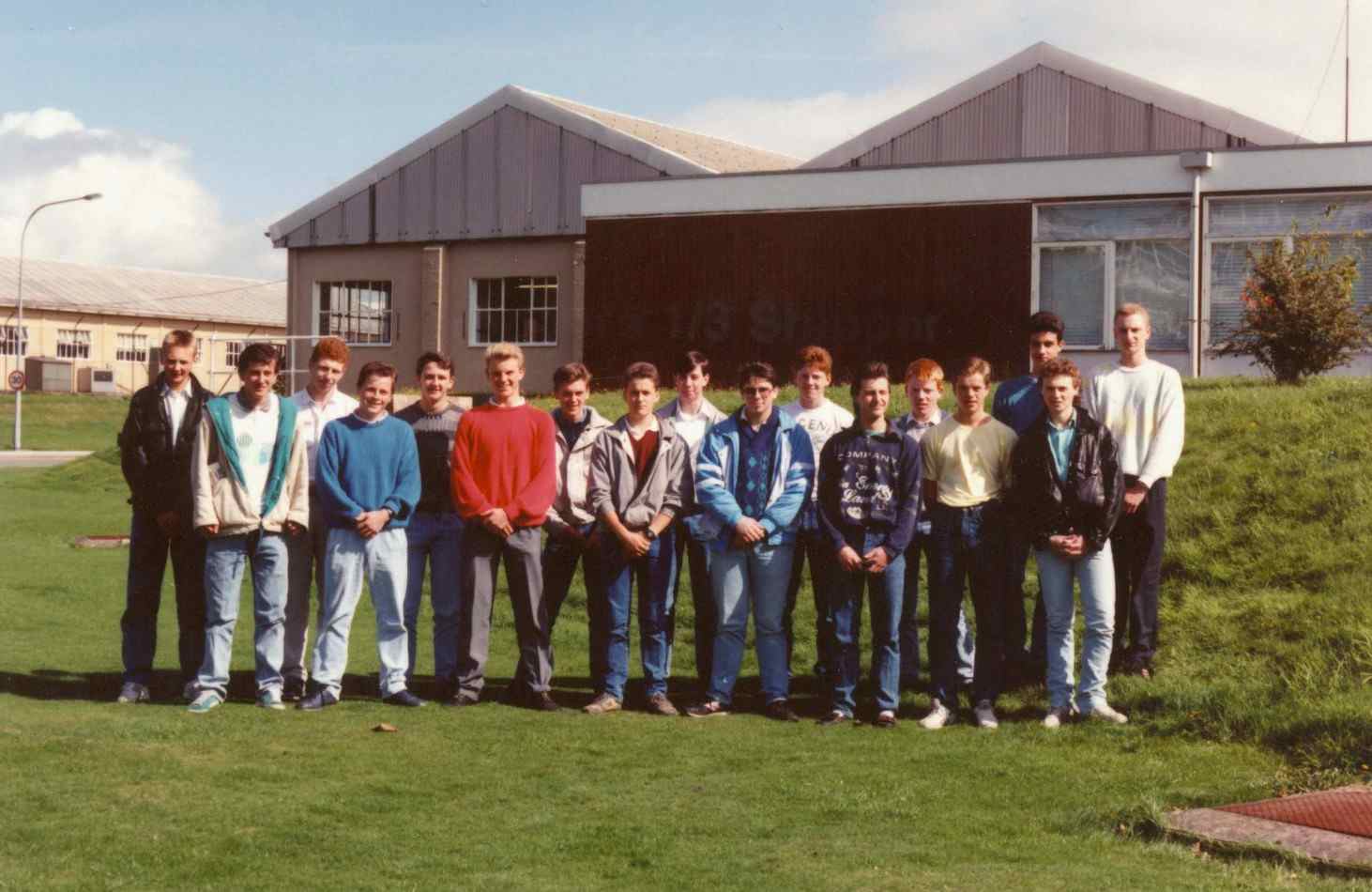 '88 Intake outside the training school in September '88 From the left: Paul Meadows, Ian Carter, Gary Kelly, Ste Hilton, Frank Worthington, Darren Reynolds, Neil Harrison, Liam Puzzar, Terence Wright, Stephen Smith, Colin Bacon, Justin Pennington, Warren Hayes, Paul Quinn, GaryHampson, Rob Waywell L & Paul Spencer. Thanks to Mike Harrisons ('84) younger brother ('88) for this photo. |