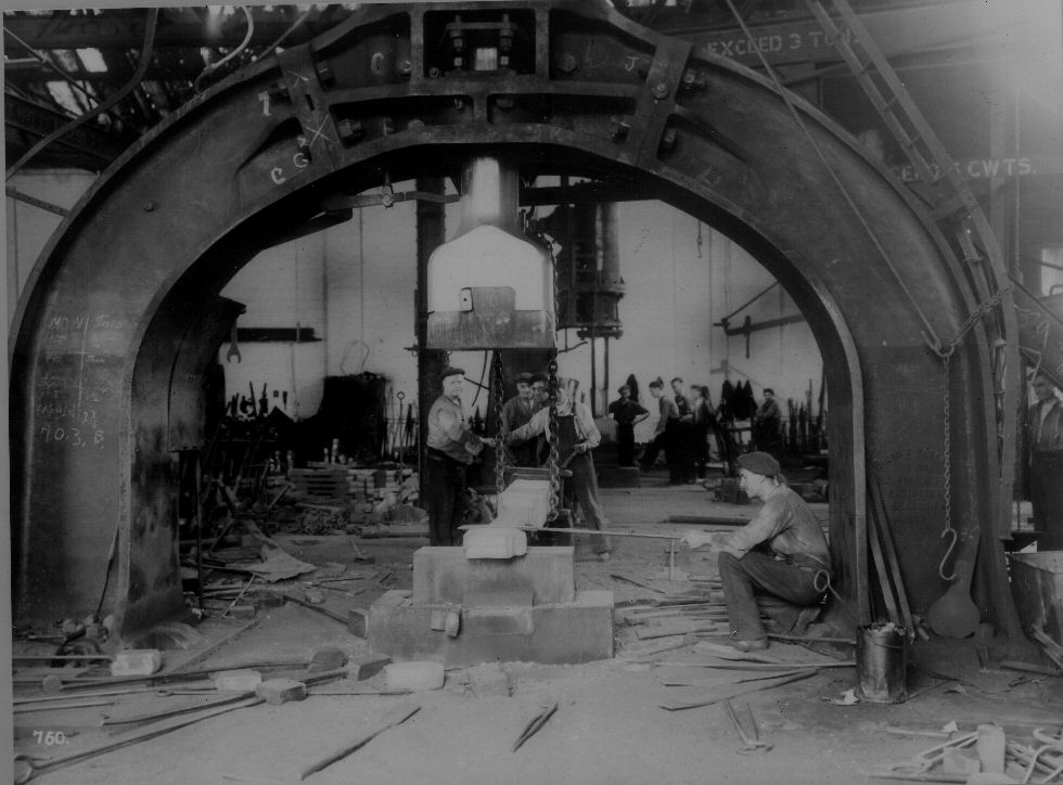 our Vulcanists using a 10 ton (20000lb) steam hammer to work the red hot metal that will become a